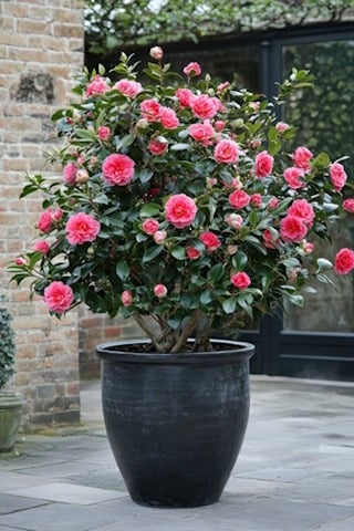 There are compact varieties ideal for container planting, such as C. sasanqua 'Fuji-no-yuki' pure white double flowers 1.5 x 1m. and Yuletide illustrated above, red flowers, good in containers 1.1m available from Suttons (affiliate link)
